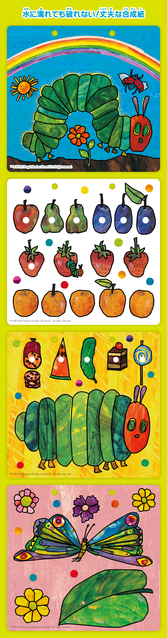 ベストセラー絵本「はらぺこあおむし」の水で塗れるぬりえです。お水のペンで発色し、まわりを汚さずきれいにぬれます。水が乾けば発色が消えるので何度でも繰り返し遊ぶことができます。水に濡れても破れない!丈夫な合成紙を使用。ペンは人間工学に基づいた形状で正しい持ち方が身につきます。ペンホルダーつきのブック型でおでかけにもぴったり!