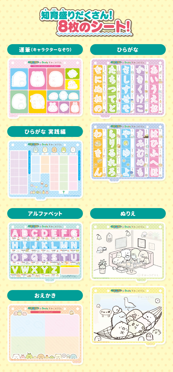 すみっコぐらしといっしょにいつでもどこでも楽しくお勉強できるよ!お水のペンで書くので服や手を汚さず、乾かせば何回でも書けます。ひらがな・ABC・おえかき・ぬりえができます。持ち運ぶこともできるので、どこでもお手軽にお勉強ができます。